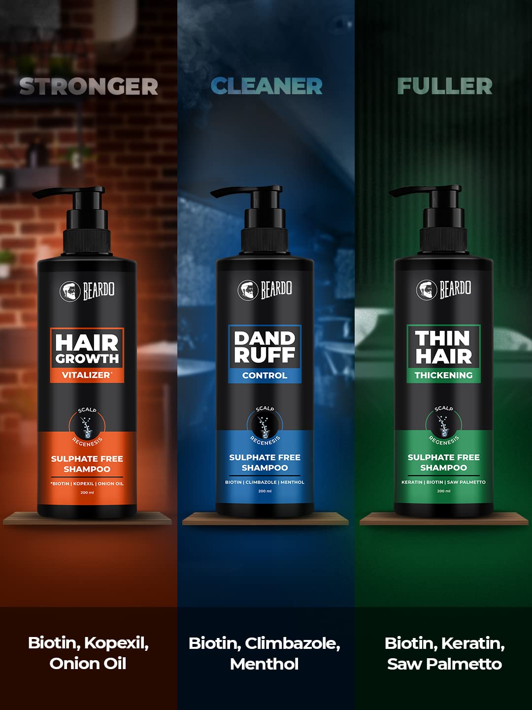 SULPHATE AND PARABEN FREE SHAMPOO DESIGNED ESPECIALLY FOR MEN: This sulfate free shampoo for hair thickening works on your scalp to protect from hair breakage related issues arising from daily pollution, dust and effects of pattern hair loss. Check out Beardo anti dandruff and Hair Growth Vitalizer.