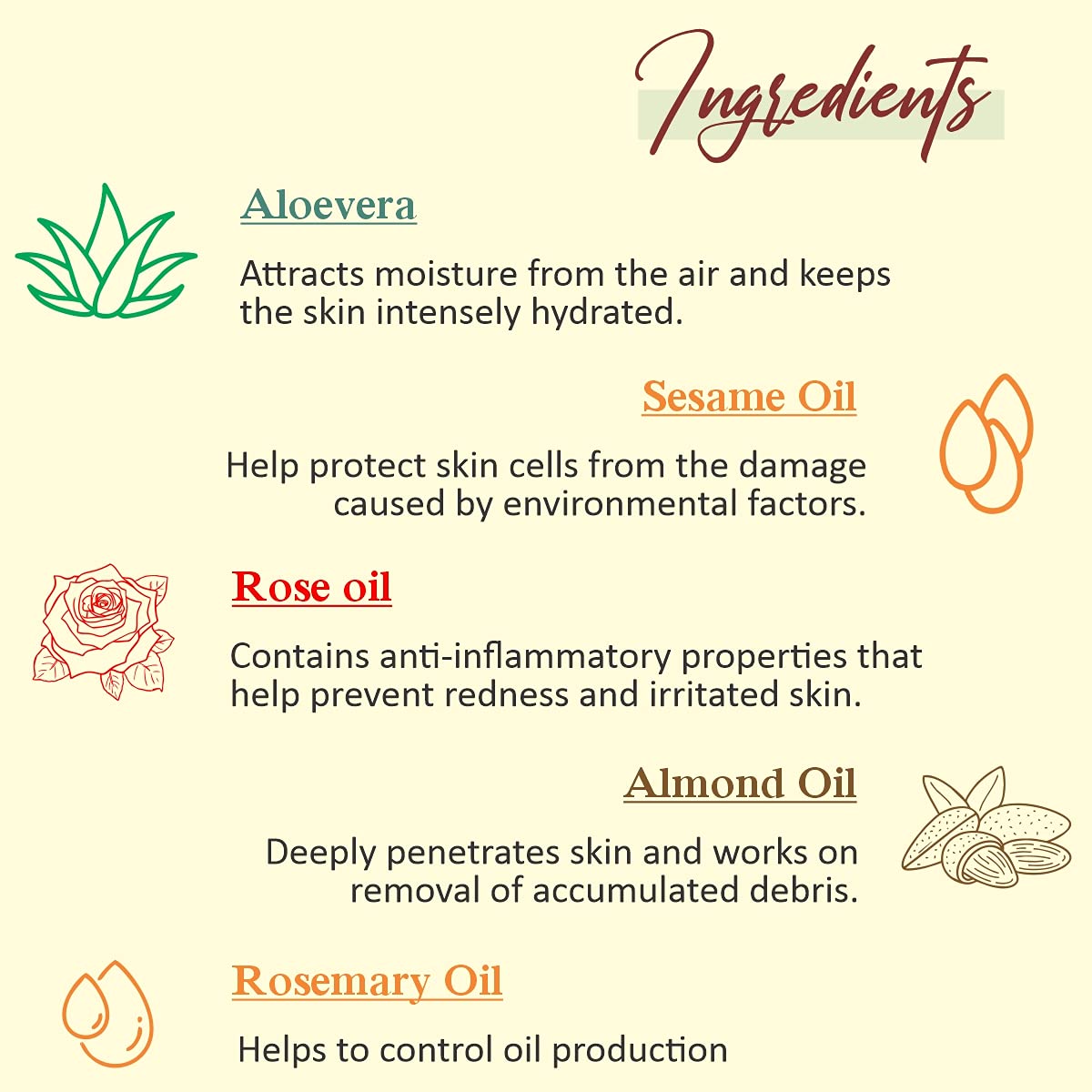 Almond Oil in the formulation benefits every skin type because of the nutrients it has. It includes a range of vitamins, proteins and minerals that are really good for our skin. It reduces the signs of ageing and has lightening and nourishing properties.
