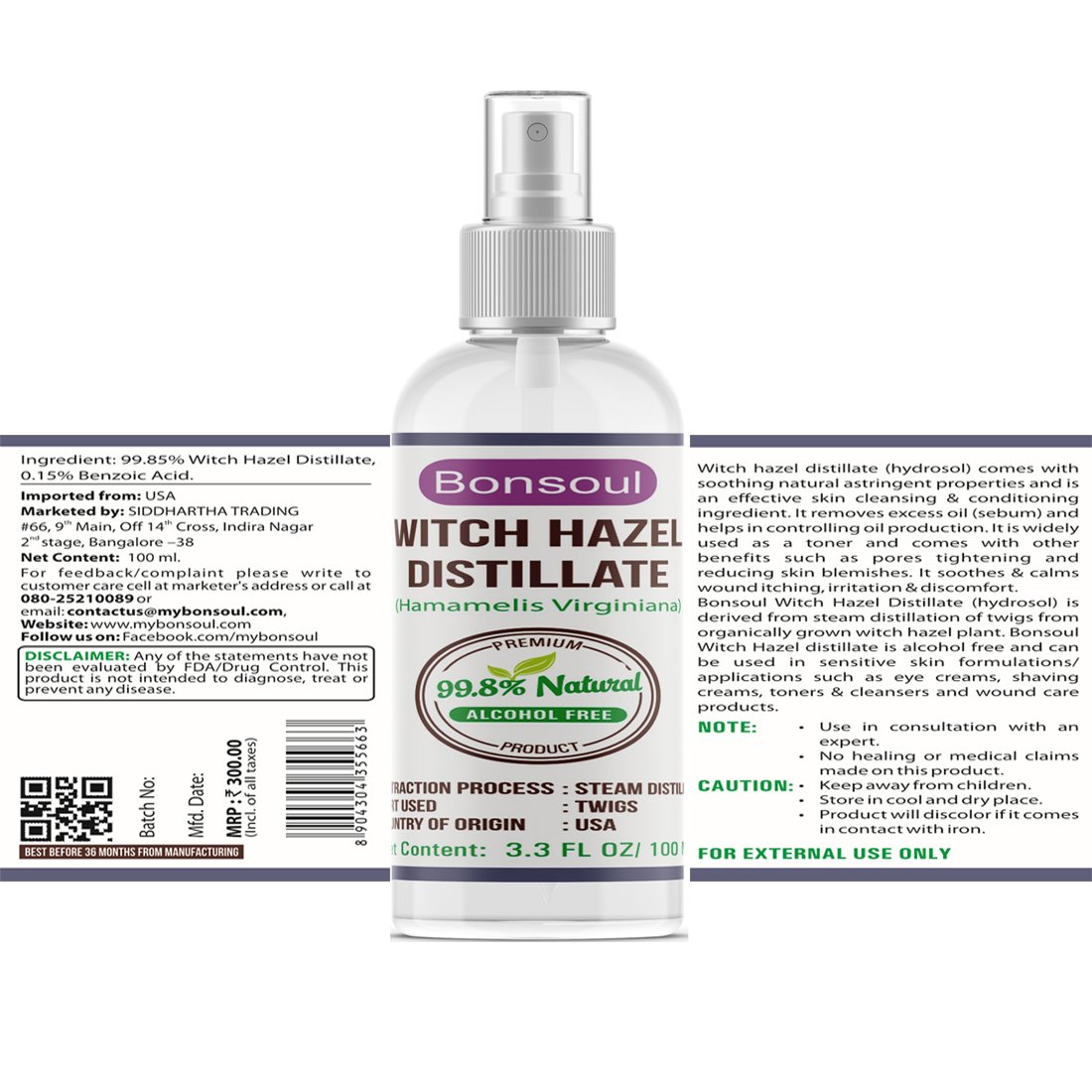 Bonsoul Witch Hazel Distillate (hydrosol) is derived from steam distillation of twigs from organically grown witch hazel plant.