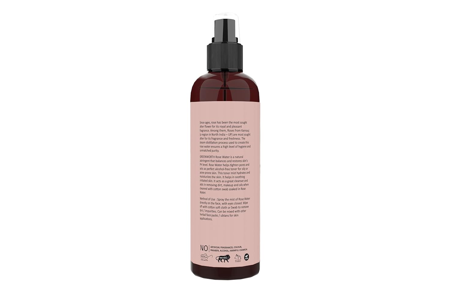 GREENWORTH Rose water mist hydrates and moisturizes the skin.