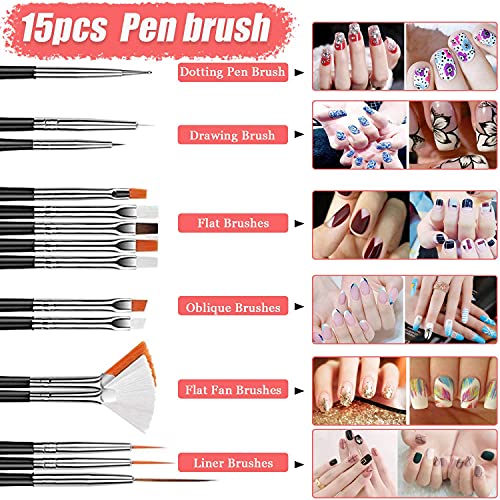 15 Pcs Nail Brushes: Nail art brush includes fan brush, liner brush, dotting pen, drawing brush, paint pen, petal brush, flat brush, angled brush which can provide you for drawing variety of nail art design pattern such like dots, liners, circles, flowers etc, ideal nail kit to decorate your nails.