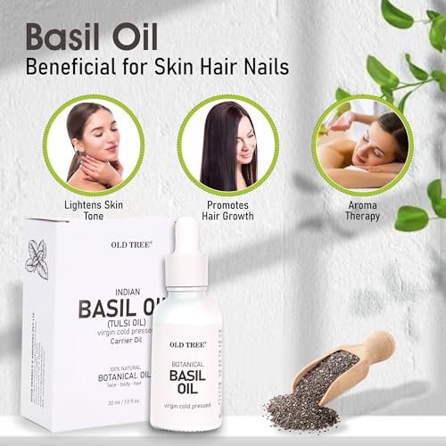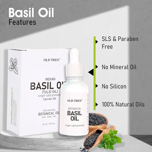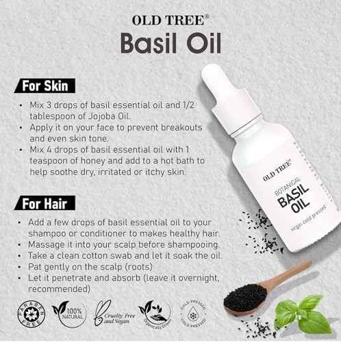 Natural and Cold Pressed: Old Tree Basil Oil is derived through a meticulous cold-pressed extraction process, preserving the integrity of the basil’s natural compounds, making it an authentic and pure choice for both skin and hair care.