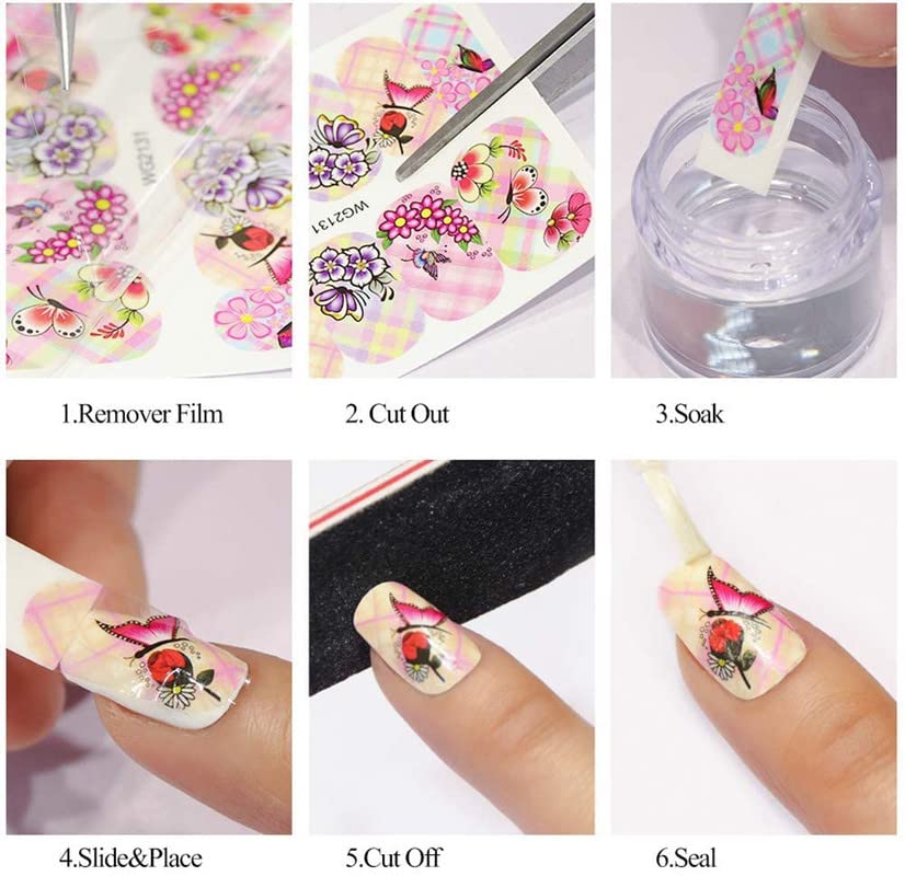 do not ues in hot water…… Nail art stickers Easy to use roughly cut out the desired pattern, remove the film from the product, then immerse it in water for 10-20 seconds, wet the nail with water, use tweezers to gently slide the sticker up to the surface of the nail and press firmly