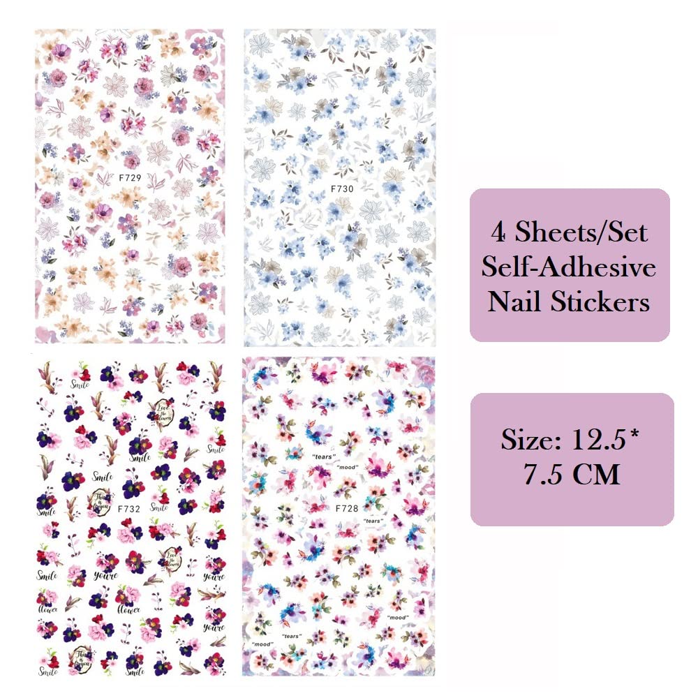 S.A.V.I 4 Sheets Self-Adhesive Floral Nail Stickers, Nail Decorations Fashion Accessories DIY Manicure