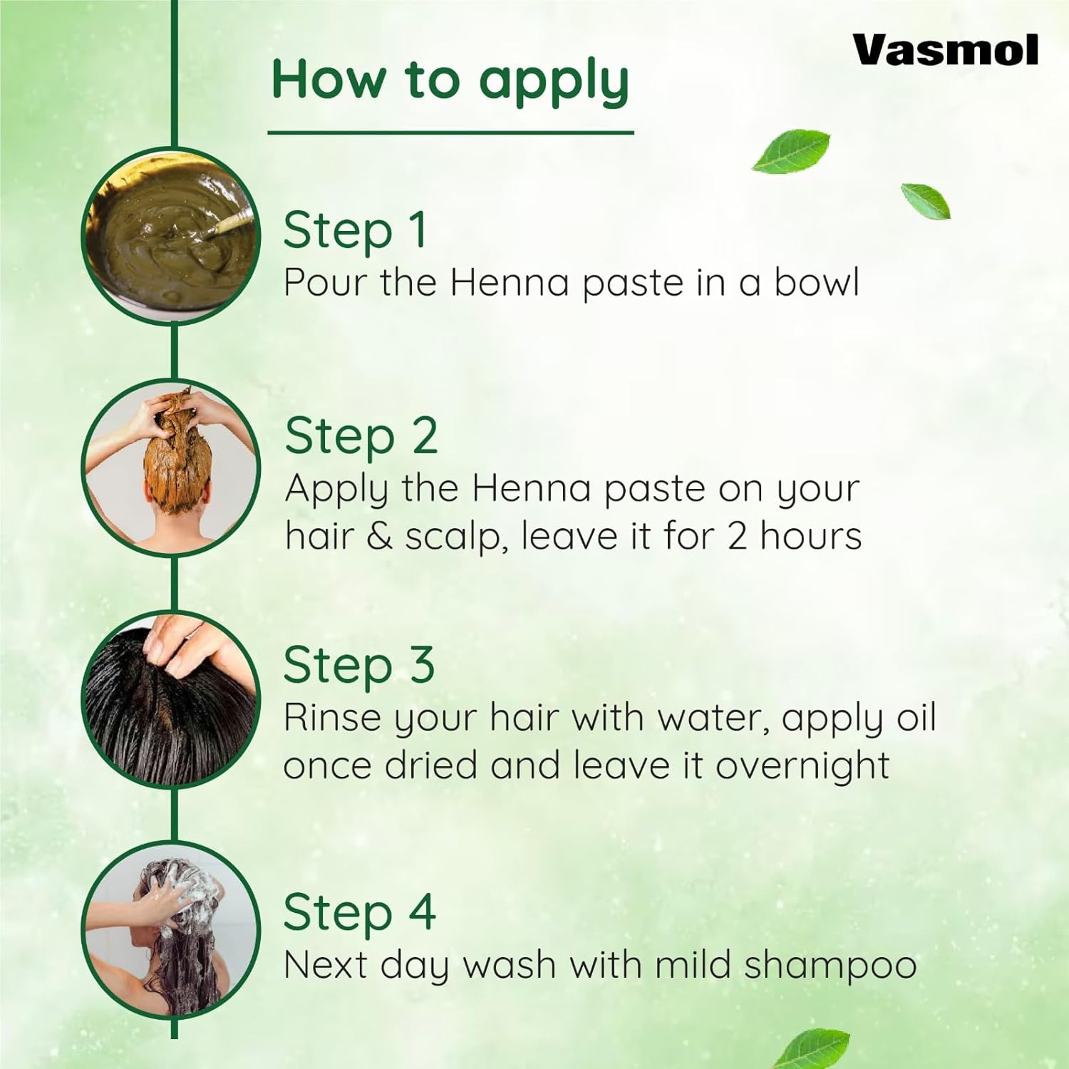 Vasmol Natural Henna Paste is a ready to use paste with 100% pure Henna and natural ingredients like beetroot, coffee, sage oil and etc. Natural heena paste is free from ammonia, PPD, bleach and synthetic colors. Vasmol natural henna paste covers your grey with rich brown colour and condition them to look smooth and shiny.